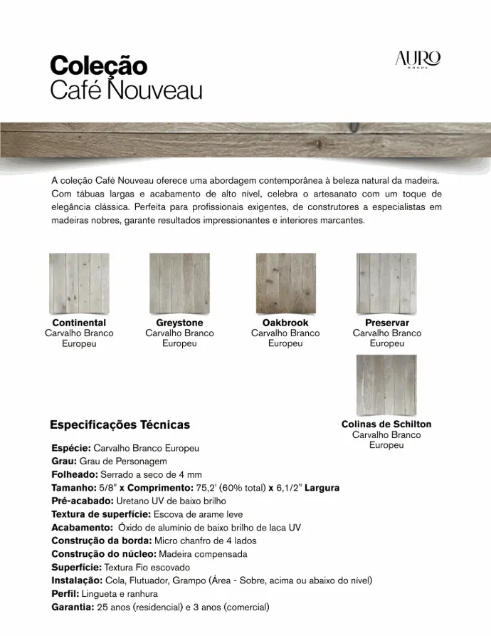 A coleção Café Nouveau oferece uma abordagem contemporânea à beleza natural da madeira. Com tábuas largas e acabamento de alto nível, celebra o artesanato com um toque de elegância clássica. Perfeita para profissionais exigentes, de construtores a especialistas em madeiras nobres, garante resultados impressionantes e interiores marcantes.